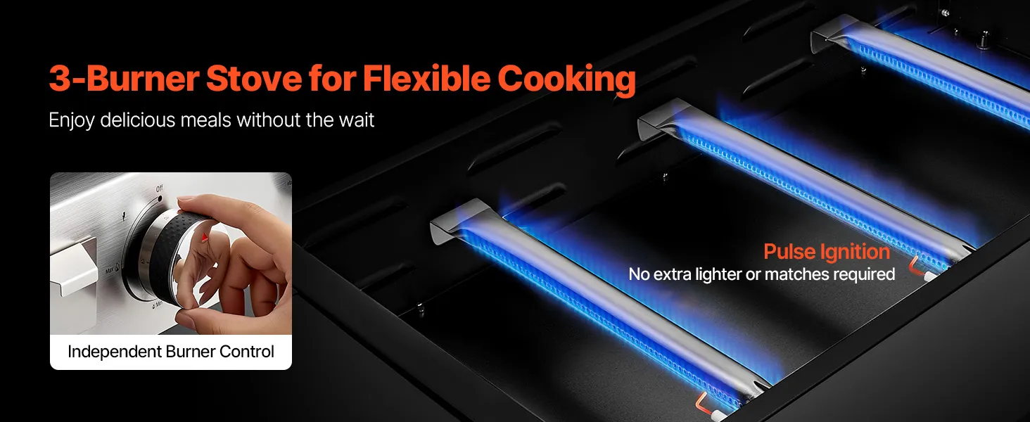 With our flat top grill, you can prepare multiple meals at the same time. The 3 burners allow different heat zones for versatile cooking styles, from searing to frying. A spacious surface keeps food flowing for family, friends, camping, or party events.