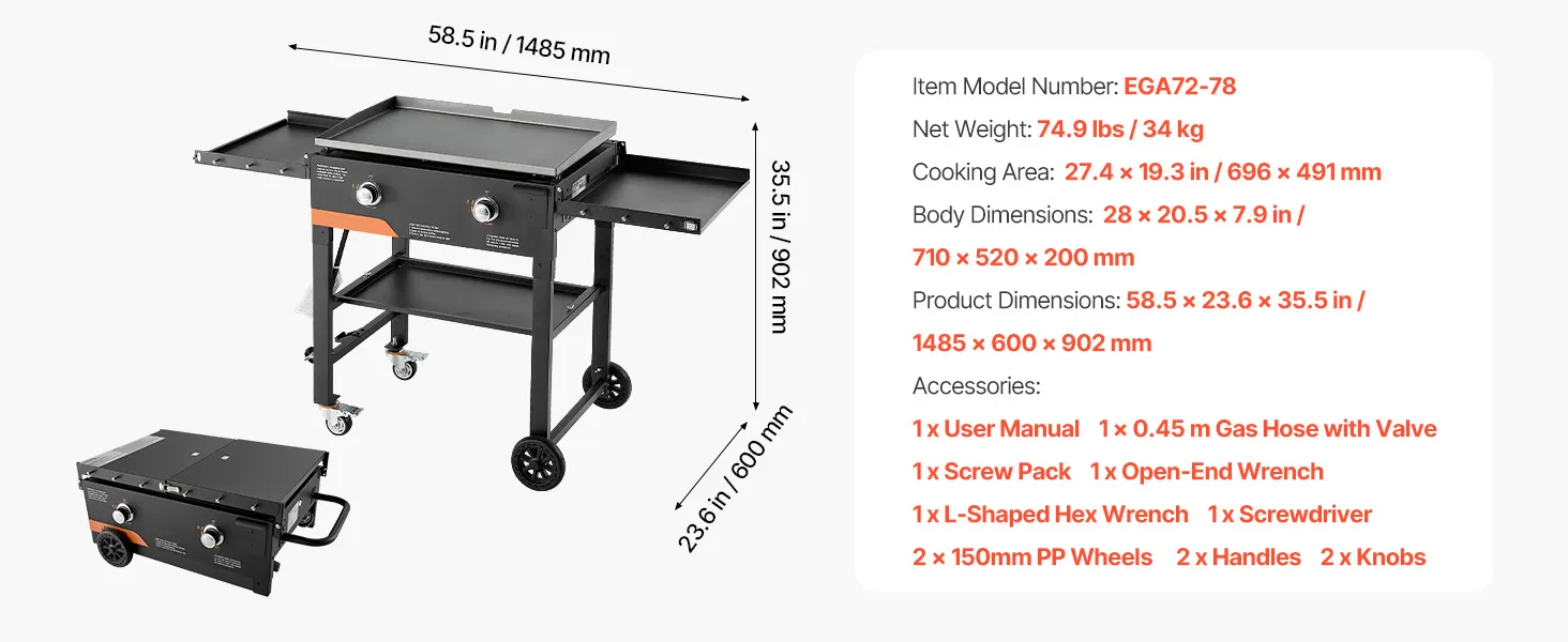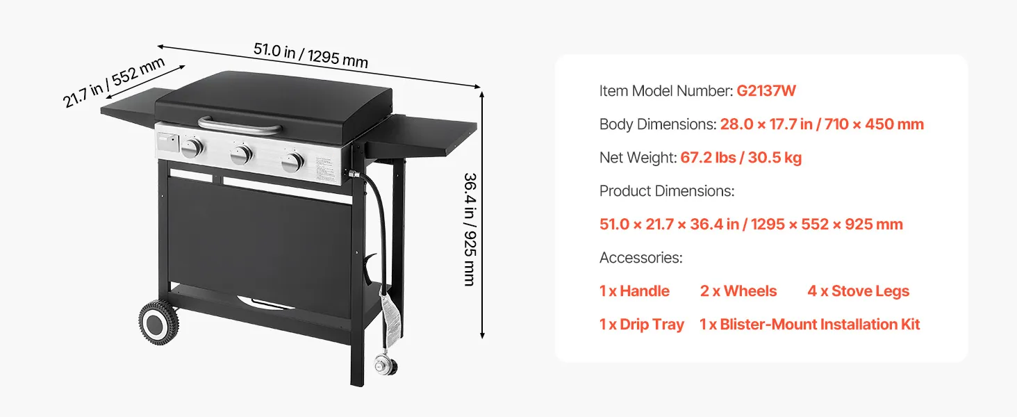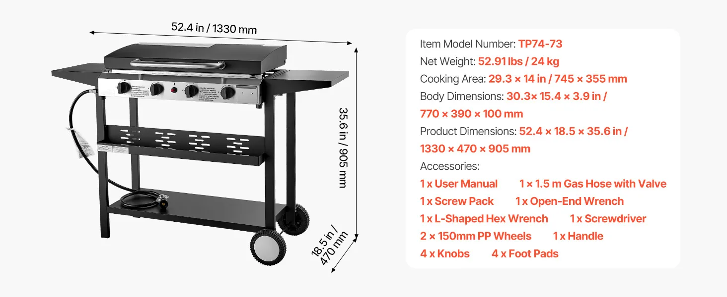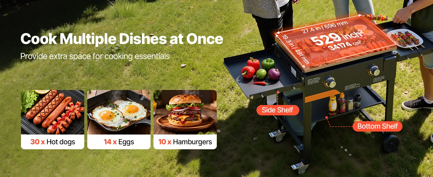 - Spacious Cooking Zone: With a 28-inch/711.2mm outdoor flat top grill providing 27.40 x 19.33 inch/695.96 x 490.98mm of cooking space, you can cook multiple dishes at once, including 25 hot dogs, 10 eggs, or 8 burgers. Ideal for family parties and outdoor gatherings, it delivers quick and efficient results