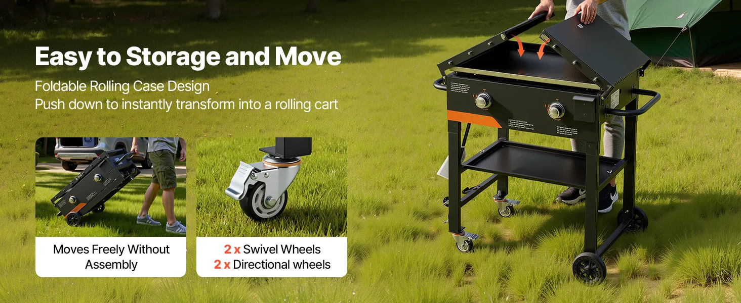 - Effortless Mobility: This propane outdoor grill cart features a foldable tabletop frame with handle, saving space and making placement simple. Dual-wheel system with 2 fixed and 2 locking swivel wheels allows quick transport to camping sites or backyard, enhancing outdoor cooking freedom