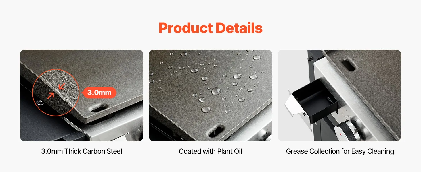 This outdoor griddle is crafted from strong carbon steel for reliable performance. Its surface is pre-coated with plant oil to help lower the chance of rust, creating a better way to cook. The added grease system collects oil neatly, simplifying maintenance.