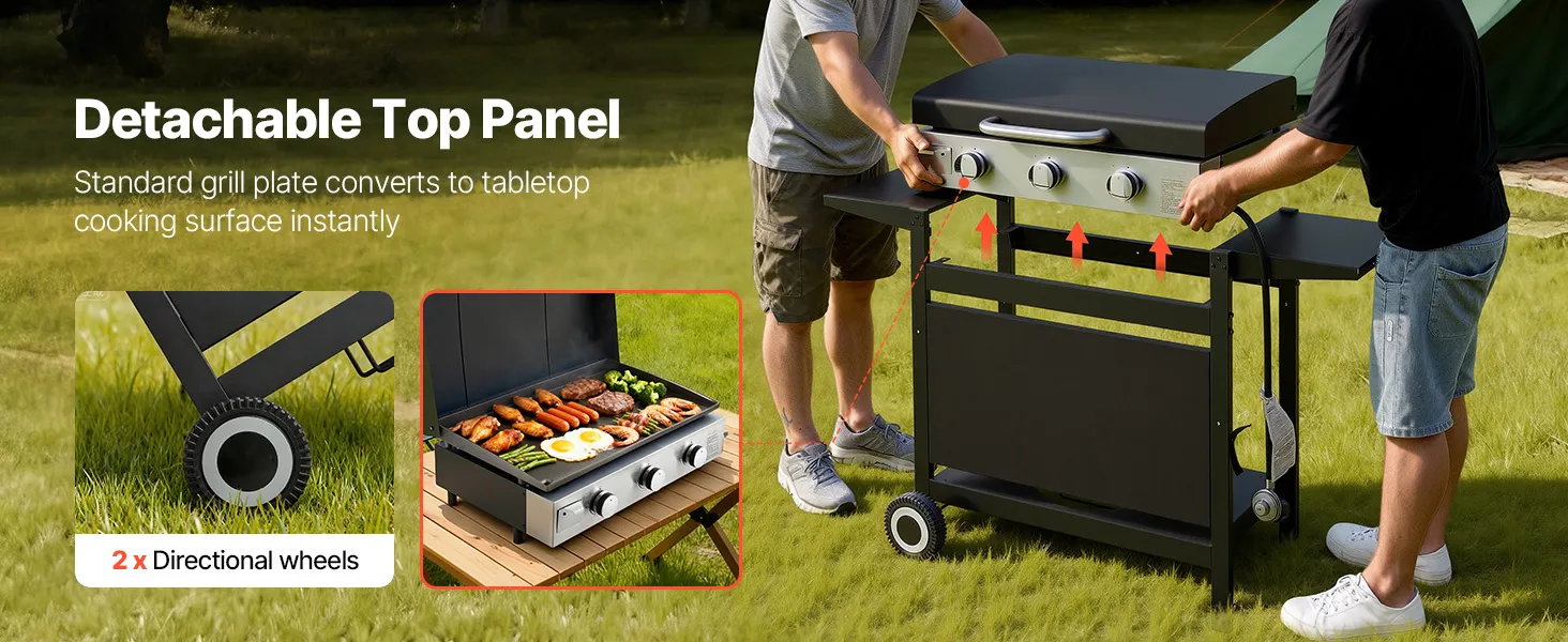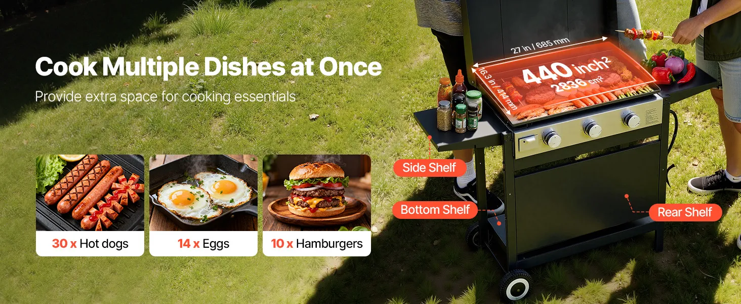 Featuring 3 powerful burners, our gas griddle offers spacious cooking space and consistent flames. With side racks, bottom storage, and dual wheels, it moves with ease. From camping to parties, it delivers reliable performance and upgrades your outdoor cooking experience.