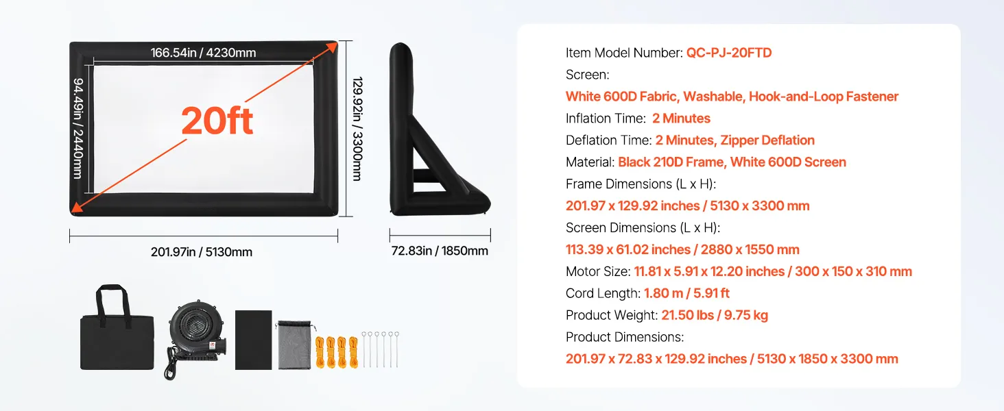 With a 12.66 x 7.11-foot screen and a normal 16:9 aspect ratio, the 20ft inflatable movie screen lets you enjoy a real movie theater experience in your own backyard or at home. The pictures are bright, clear, and high-quality, which makes movies, sports, and games seem more real.