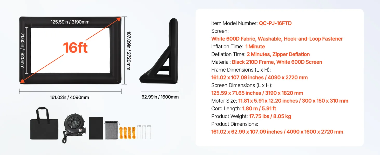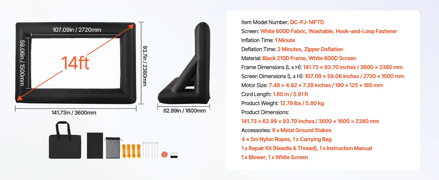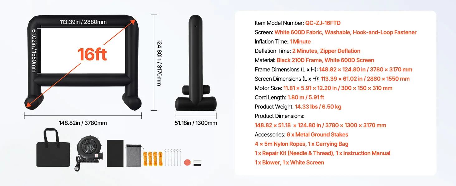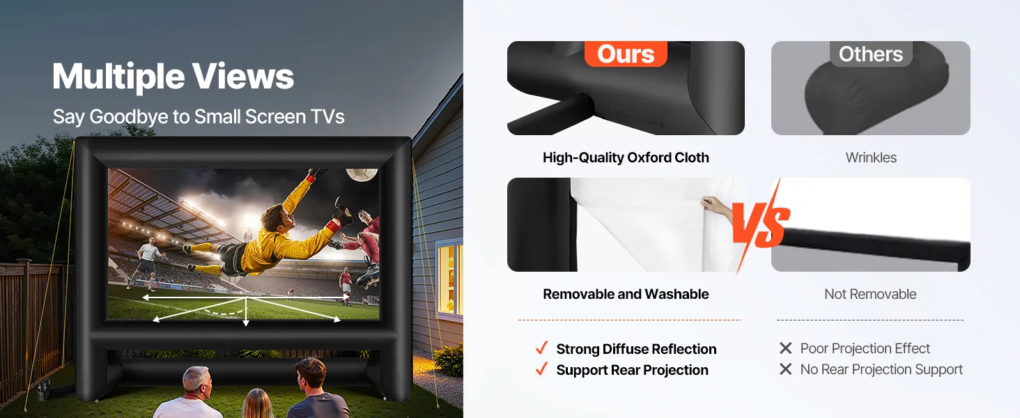 - High-quality Material: This inflatable projector screen for outside uses high-quality Oxford fabric, which can resist creases and is easy to clean, ensuring clear, high-resolution images every time. The screen size is 12.66 x 7.11 ft. Front and rear projection are available with an aspect ratio of 16:9