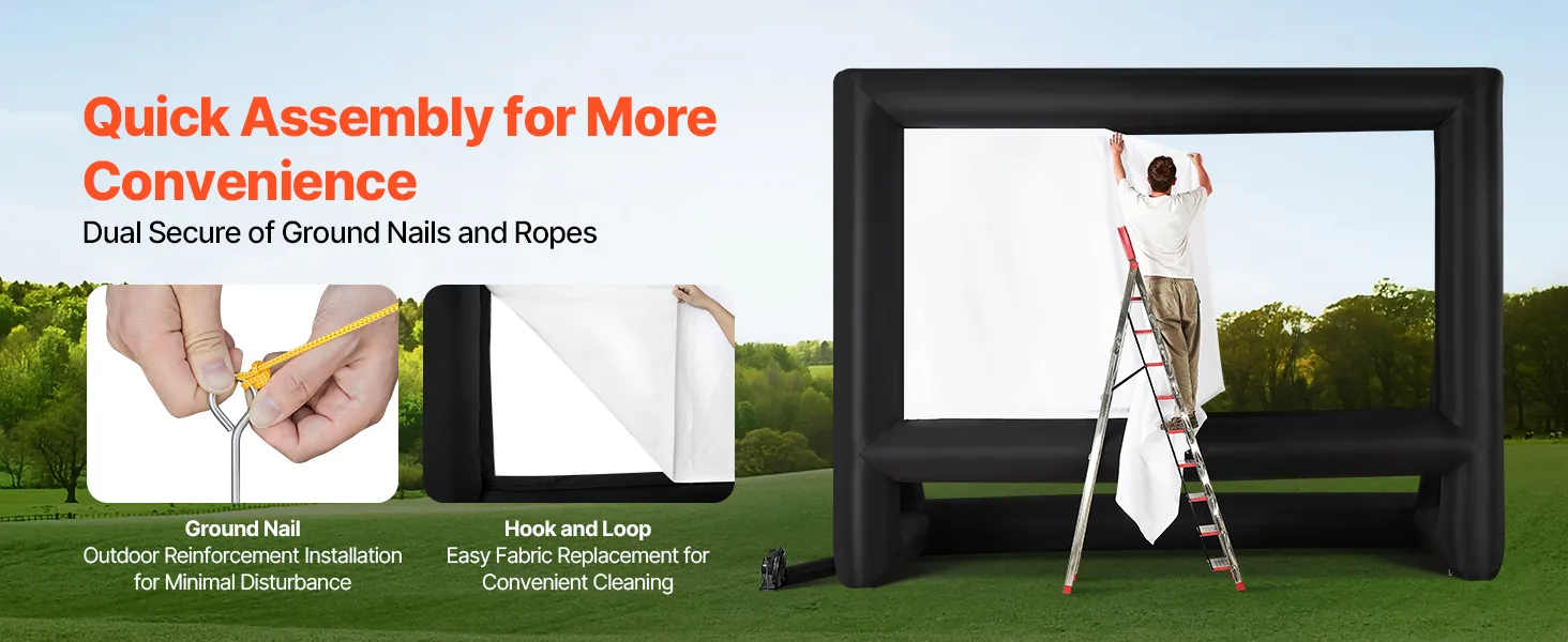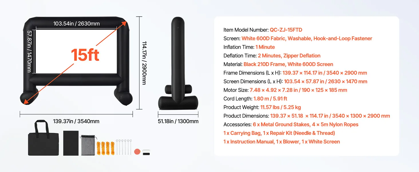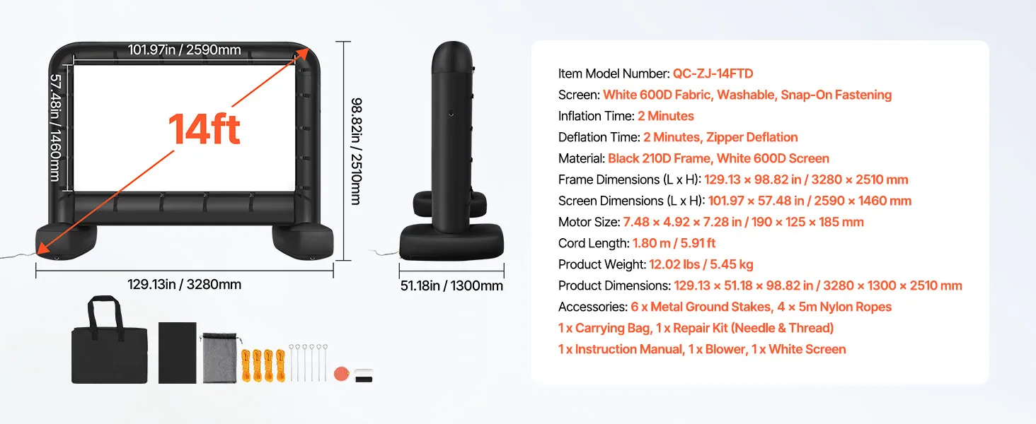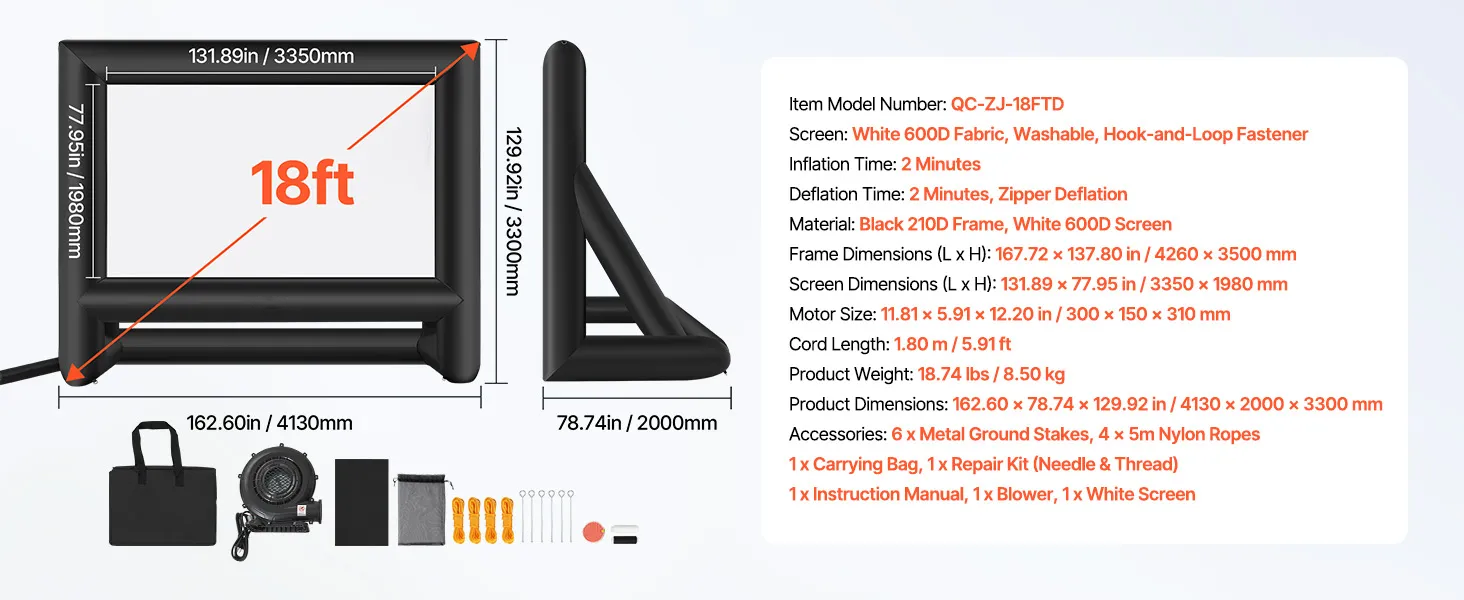 - High-quality Material: This inflatable projector screen for outside uses high-quality Oxford fabric, which can resist creases and is easy to clean, ensuring clear, high-resolution images every time. The screen size is 12.66 x 7.11 ft. Front and rear projection are available with an aspect ratio of 16:9