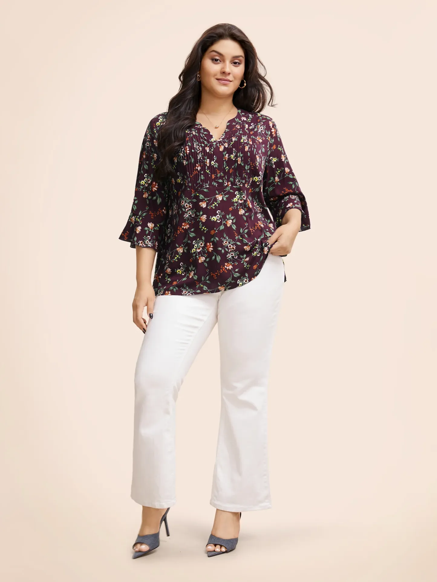 Ditsy Floral Pleated Flutter Sleeve Blouse