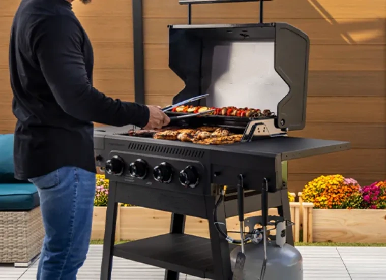Entertain with ease using the 4-Burner Cart Grill with Side Burner. Its system ensures consistent heat and juicier results, while the 435 sq. in. cook surface handles up to 25 burgers at once. Use the 11,000 BTU side burner for sauces, sides, or skillet dishes while your mains sizzle. Gear Trax® side shelves keep tools within reach, and heavy-duty wheels let you roll it where the party is. Modern, reliable, and built for multitaskers—this grill is as social as you are.