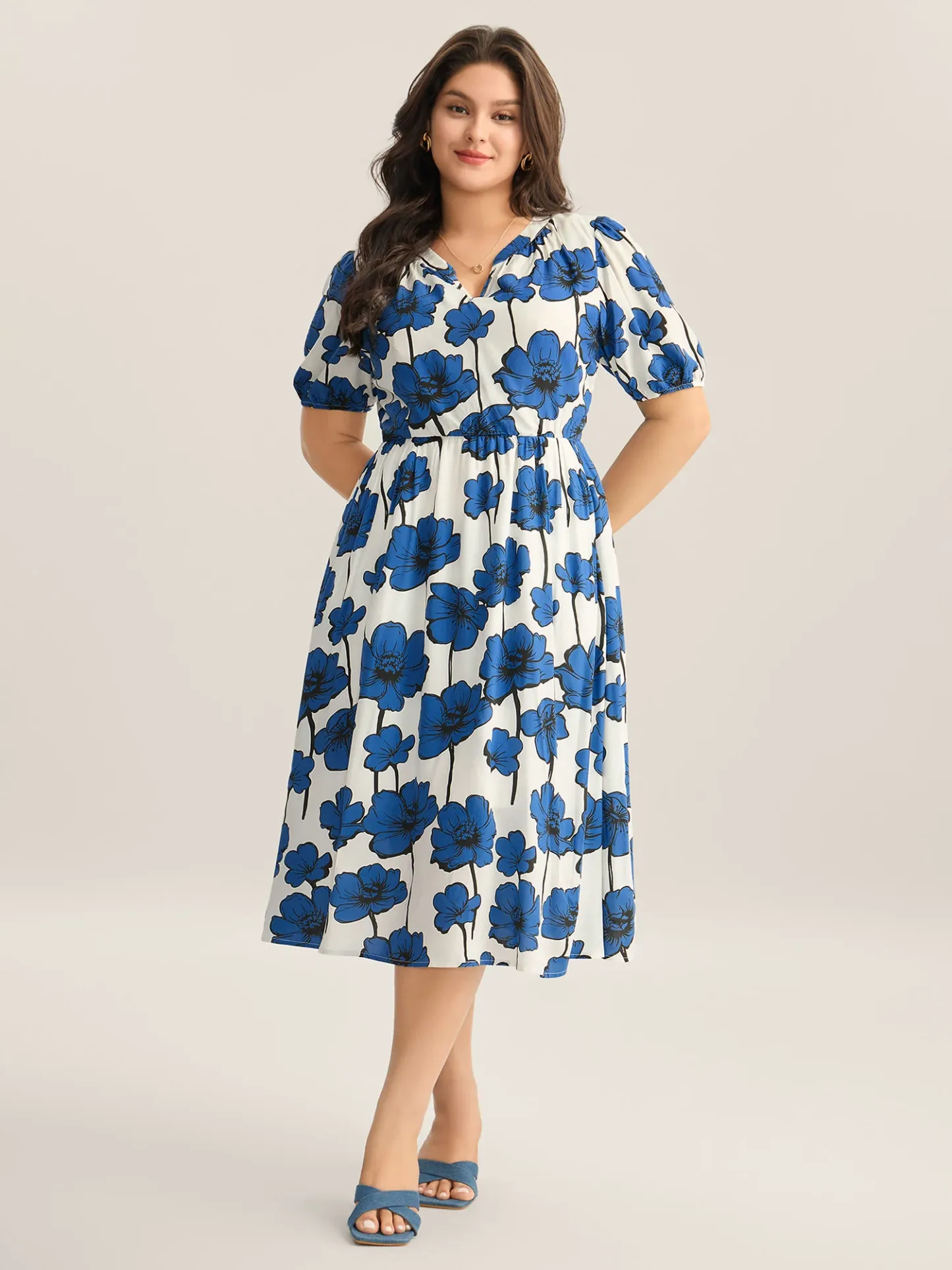 Large Floral Print Notched Collar Midi Dress