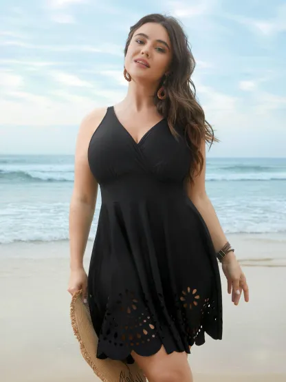 Laser Cut Surplice Neck Waist-Cinched Swim Dress