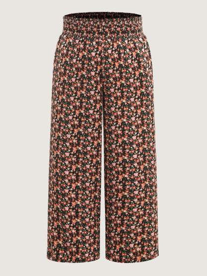 Shirred Waist Ditsy Floral Wide-Leg Pants
