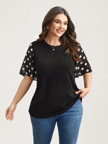 Stretchy Sheer Dot Sleeve Textured T-Shirt